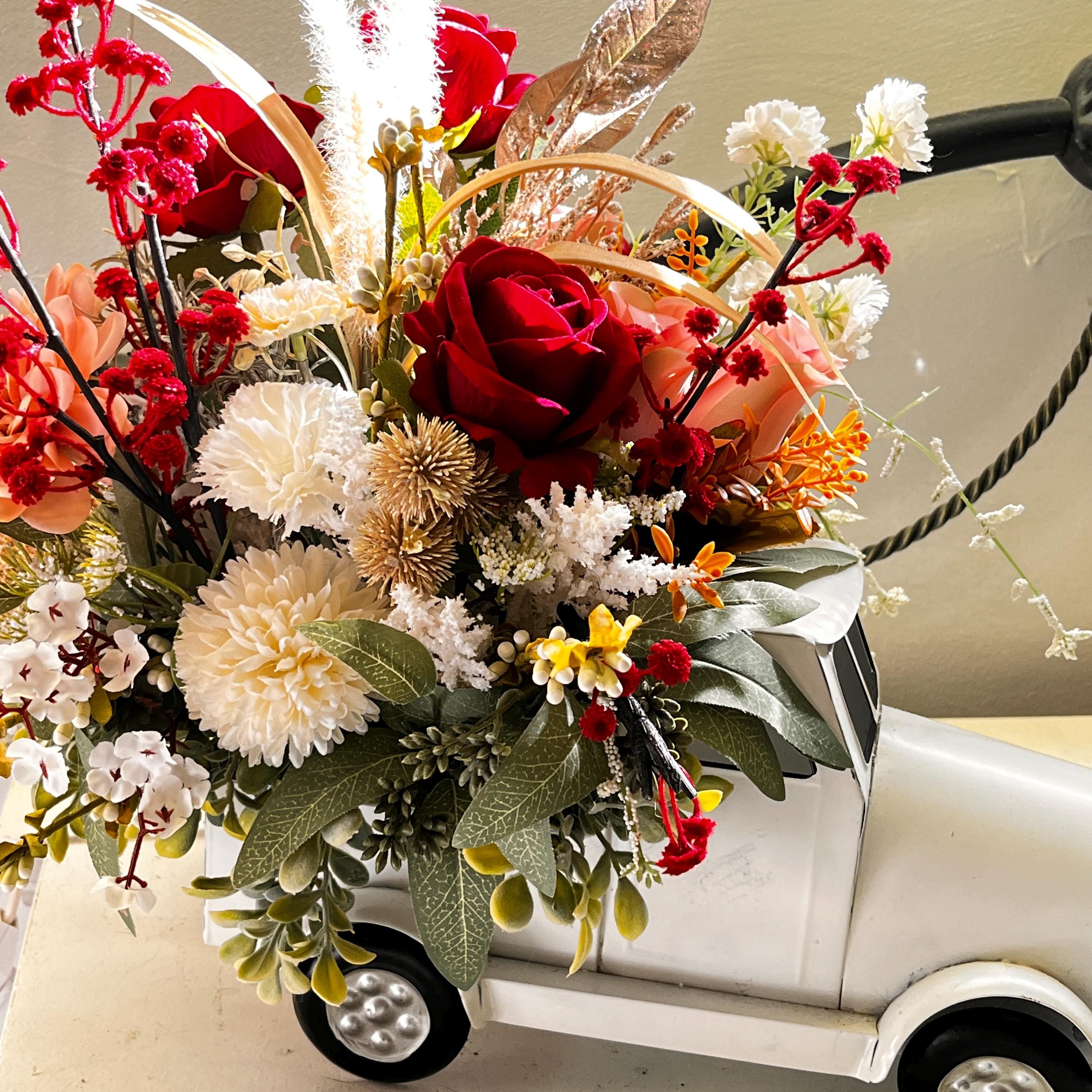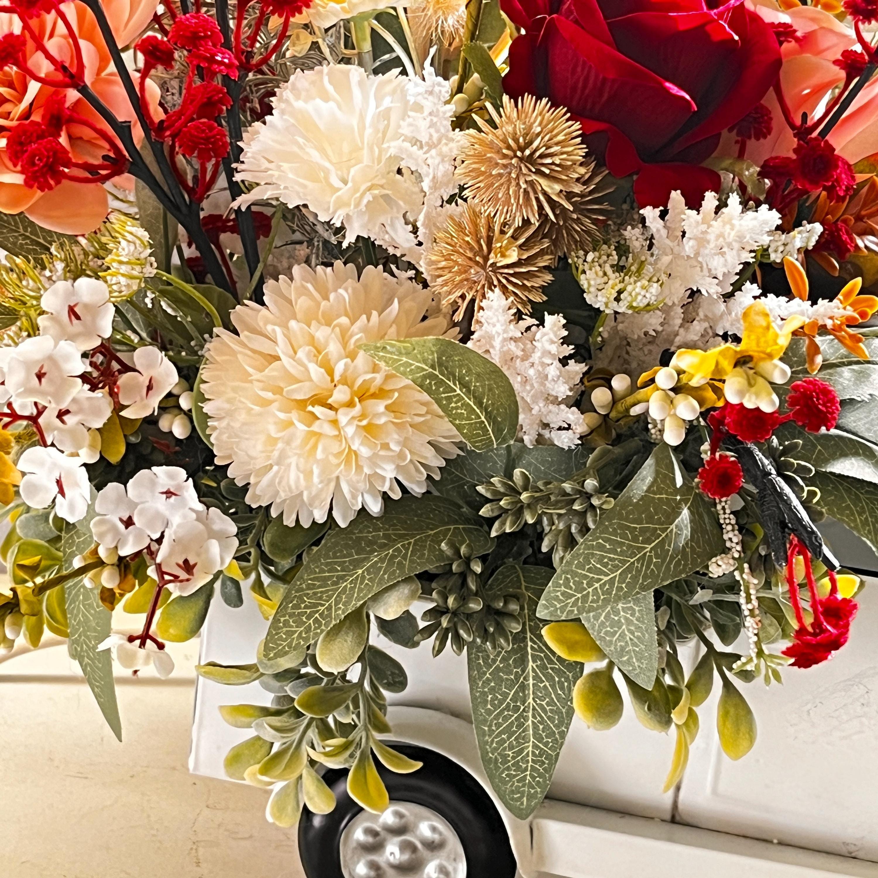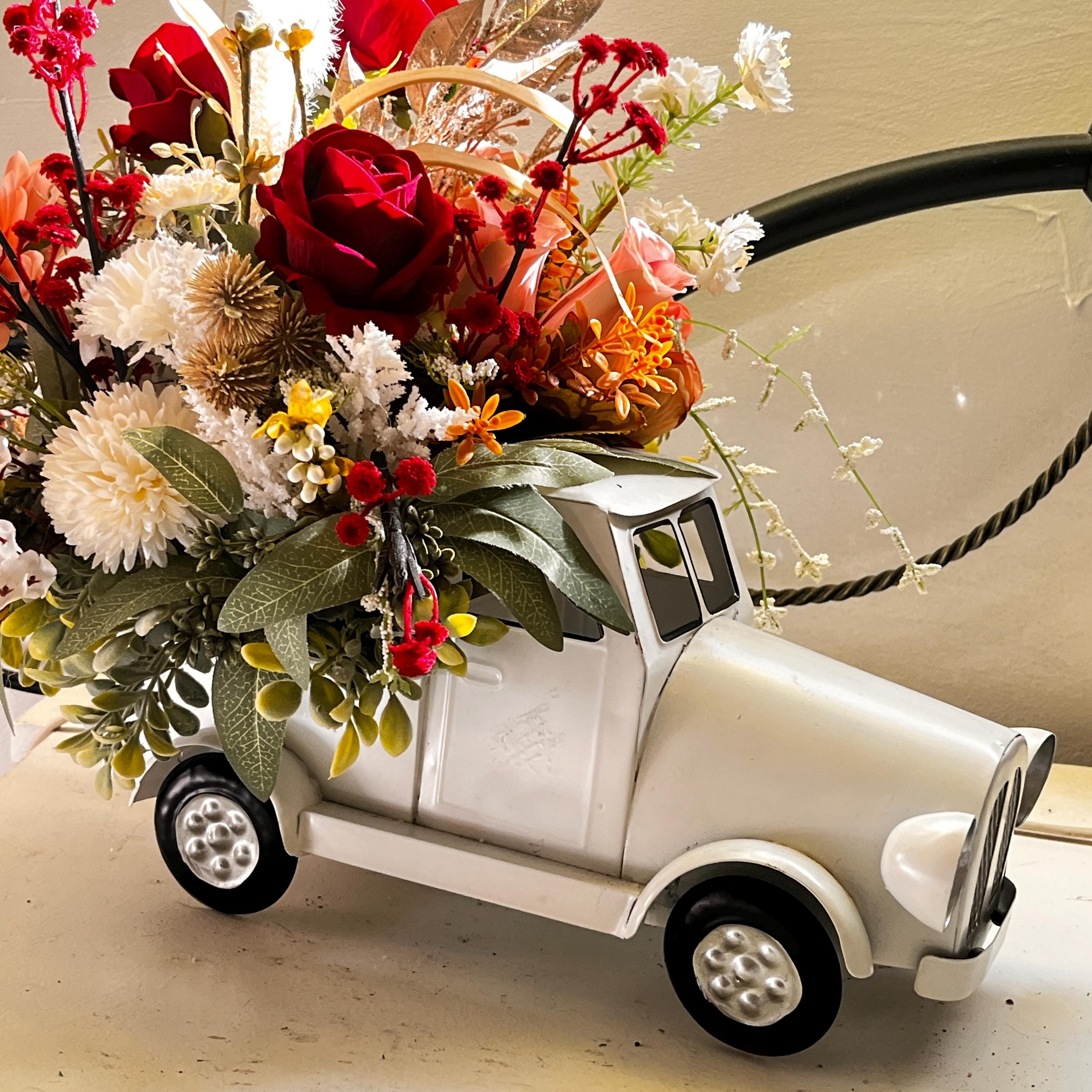 Vintage white metal truck filled with seasonal florals/red roses wildflowers