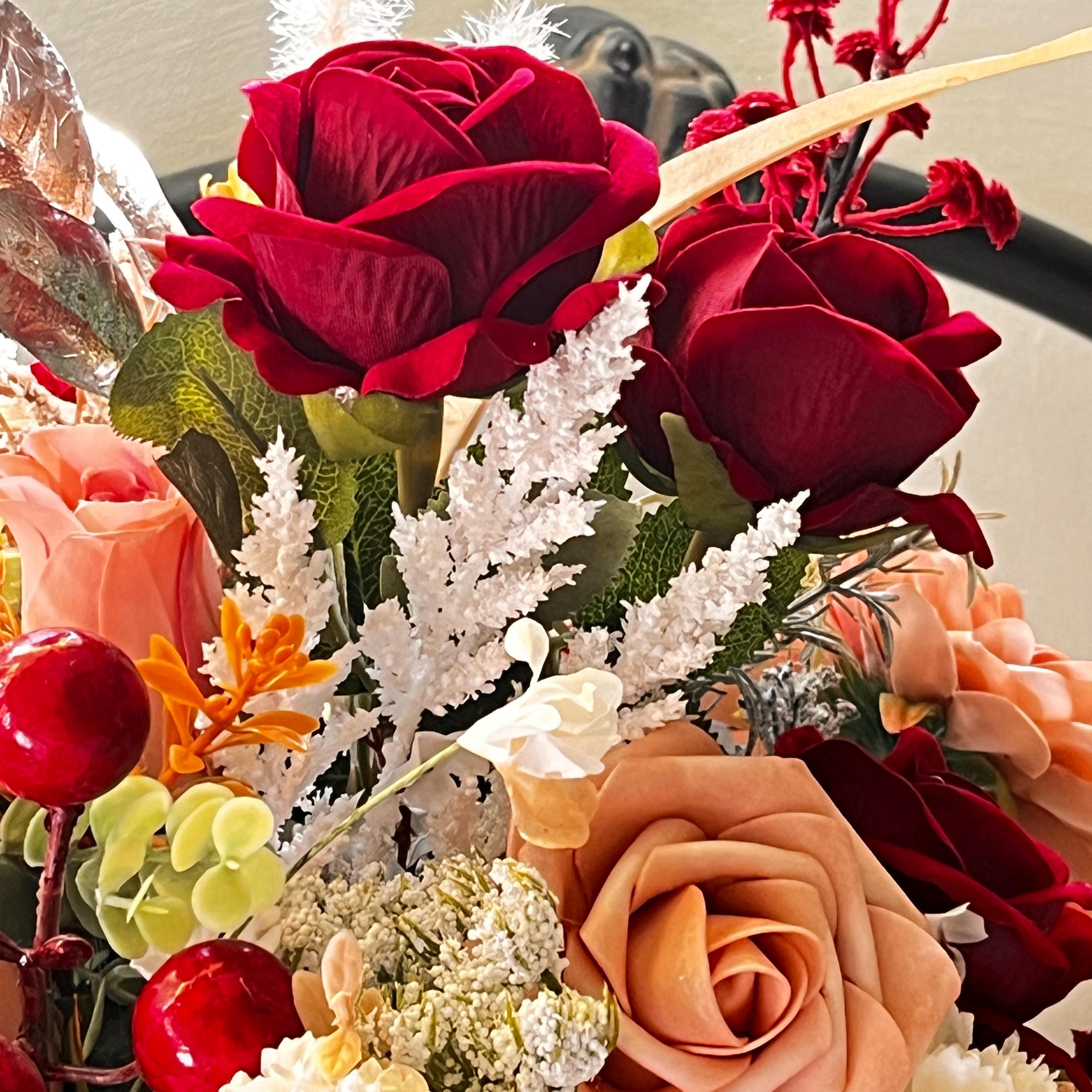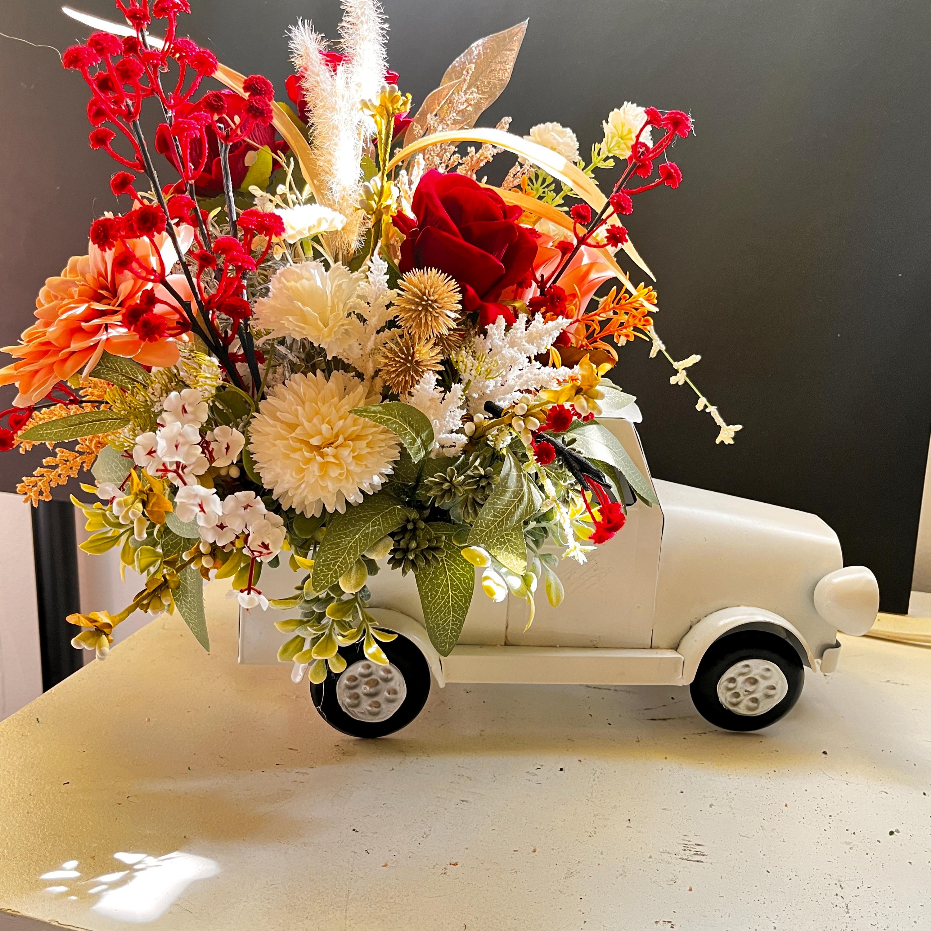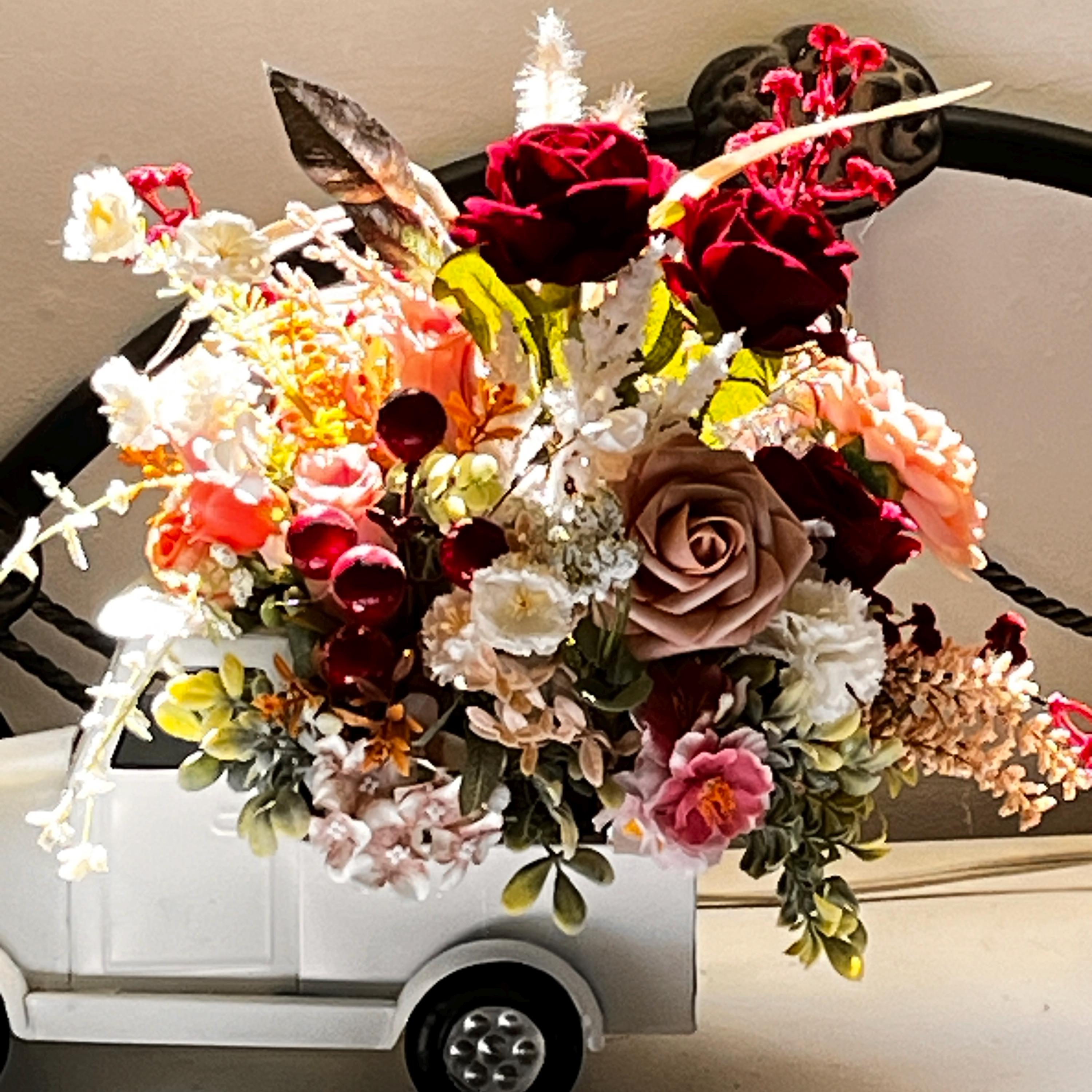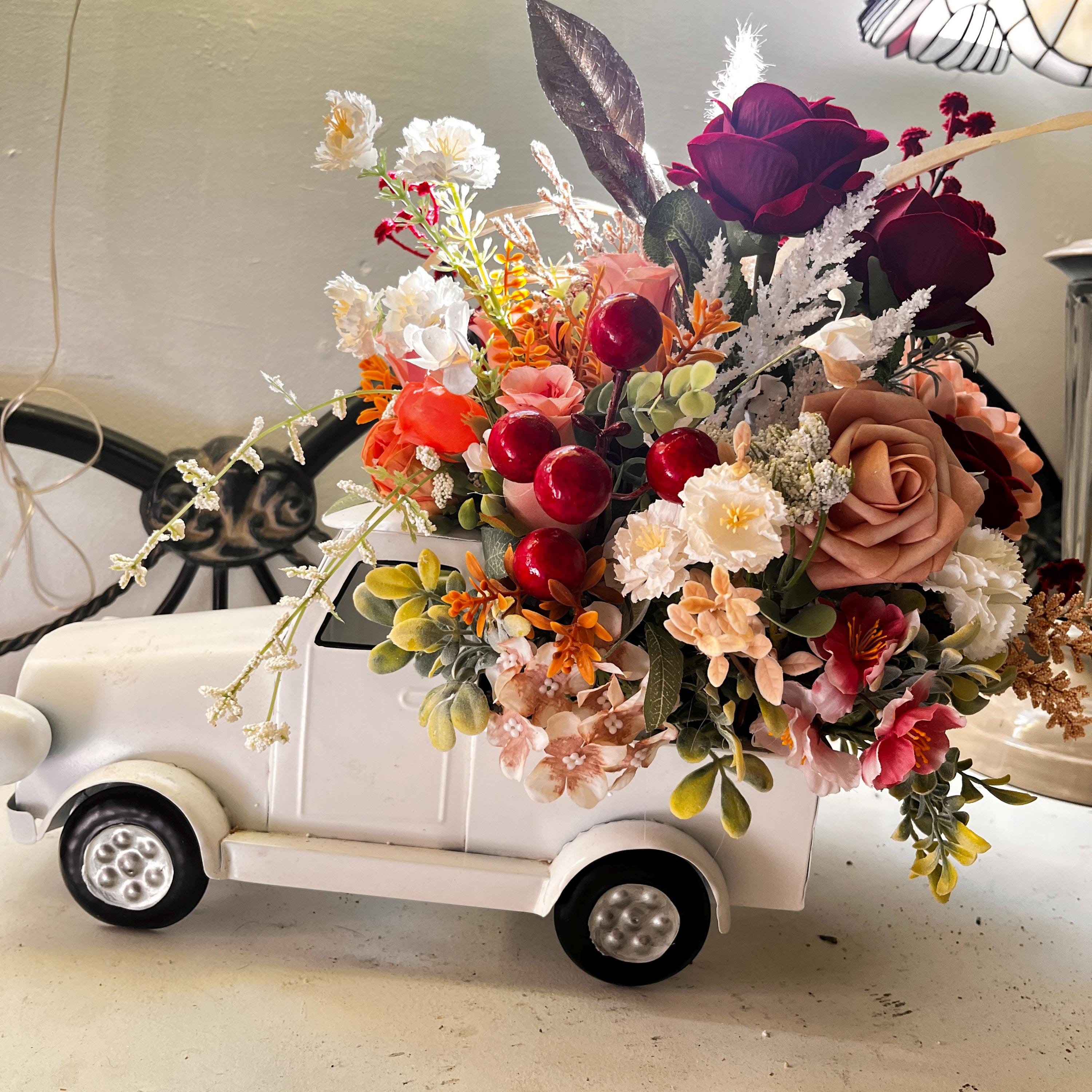 Vintage white metal truck filled with seasonal florals/red roses wildflowers