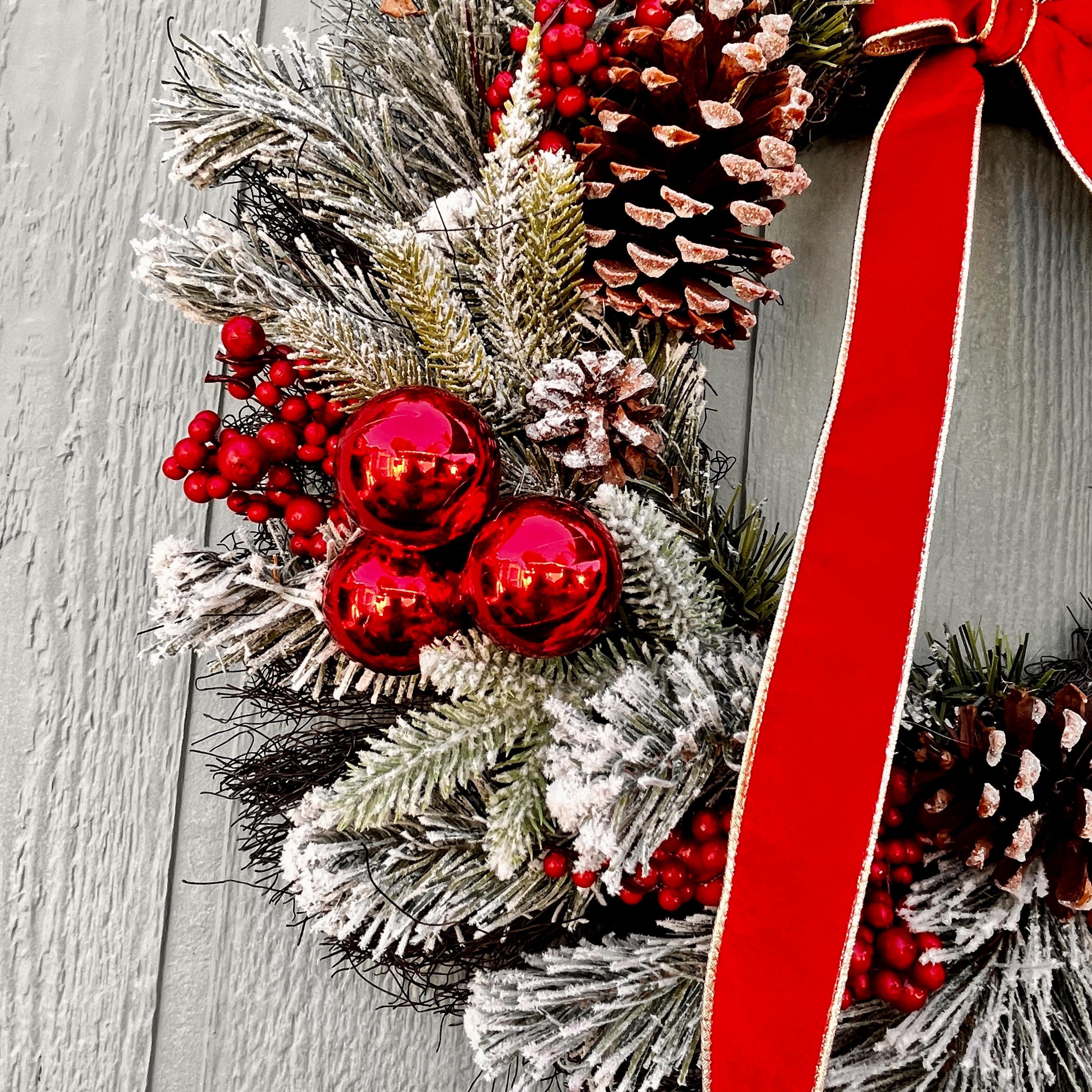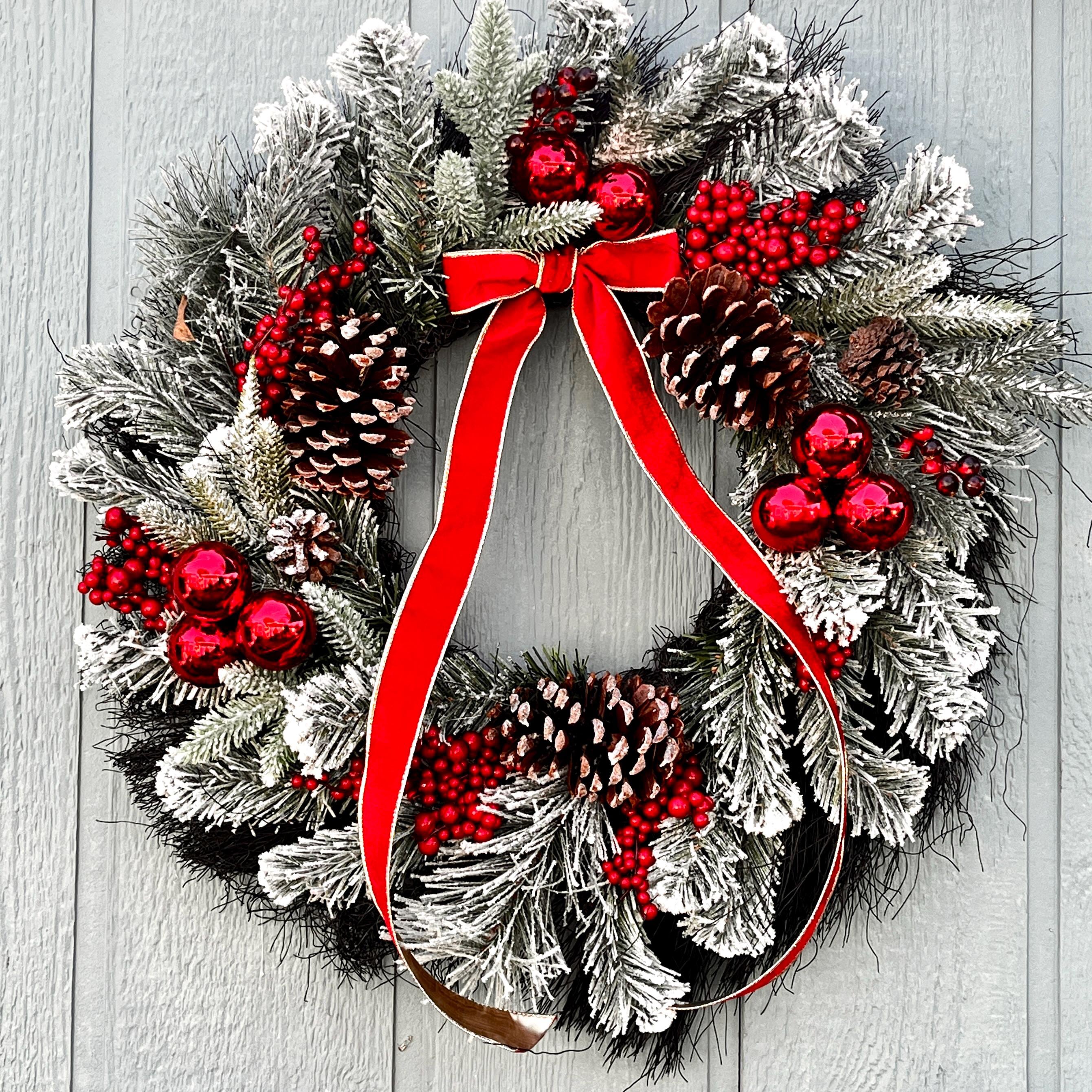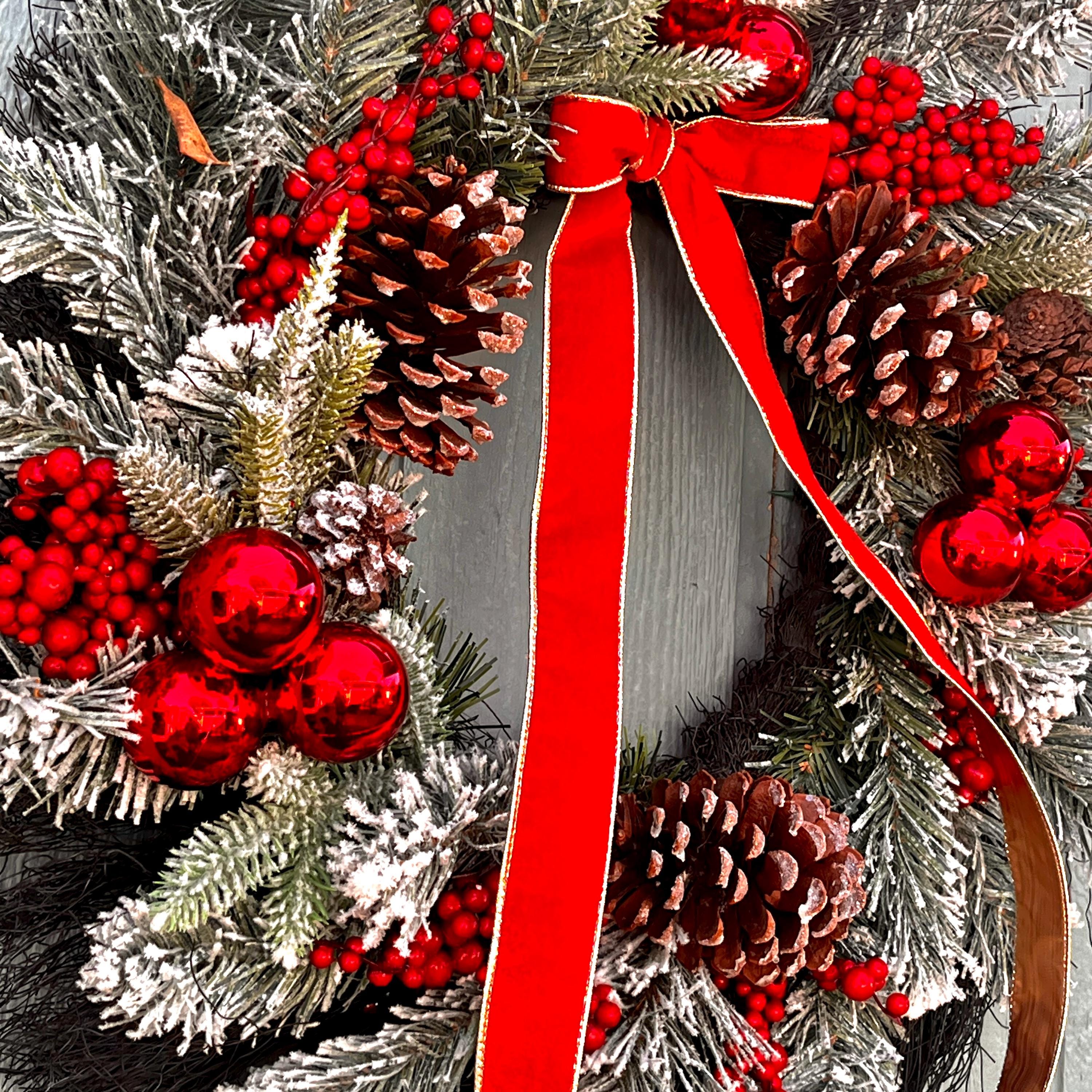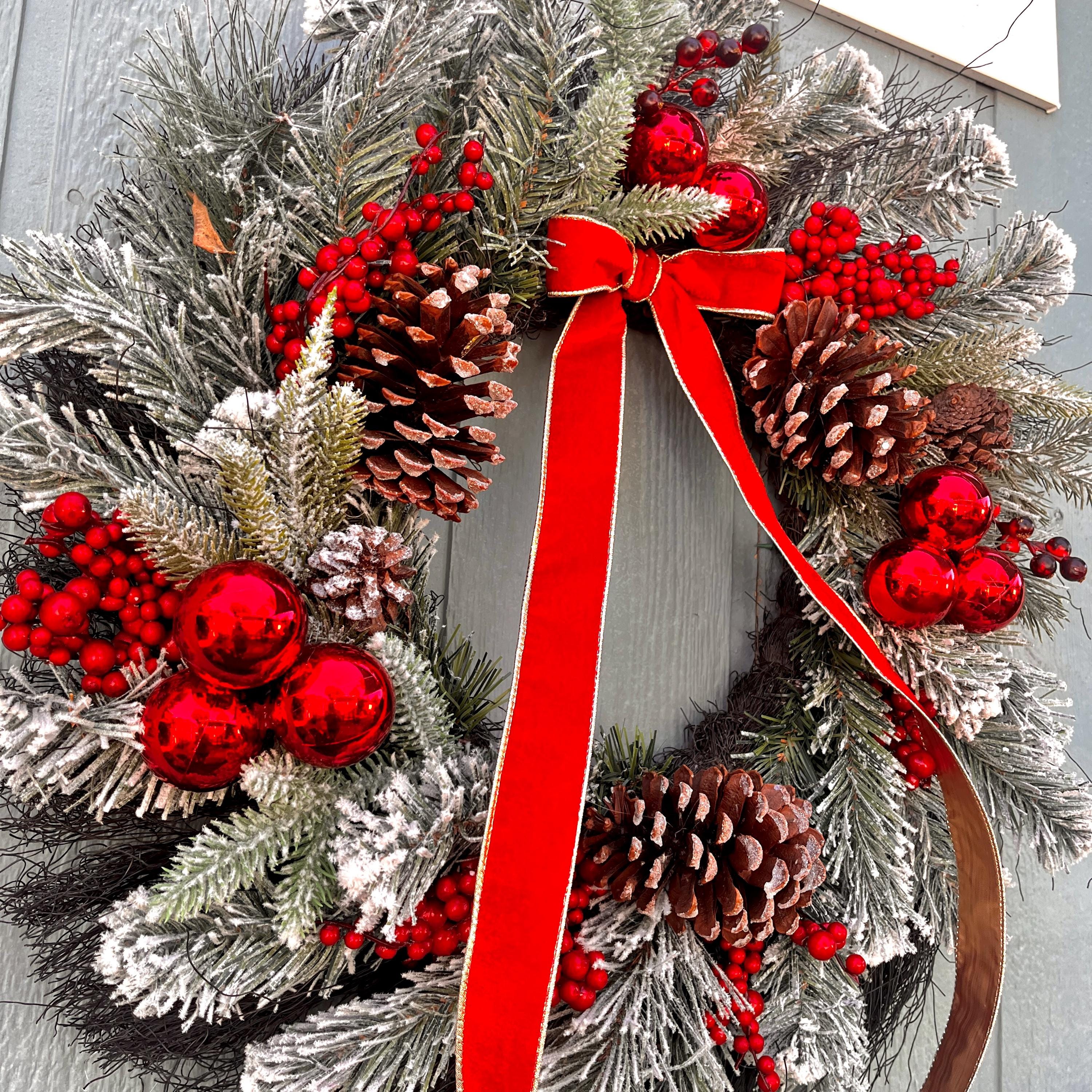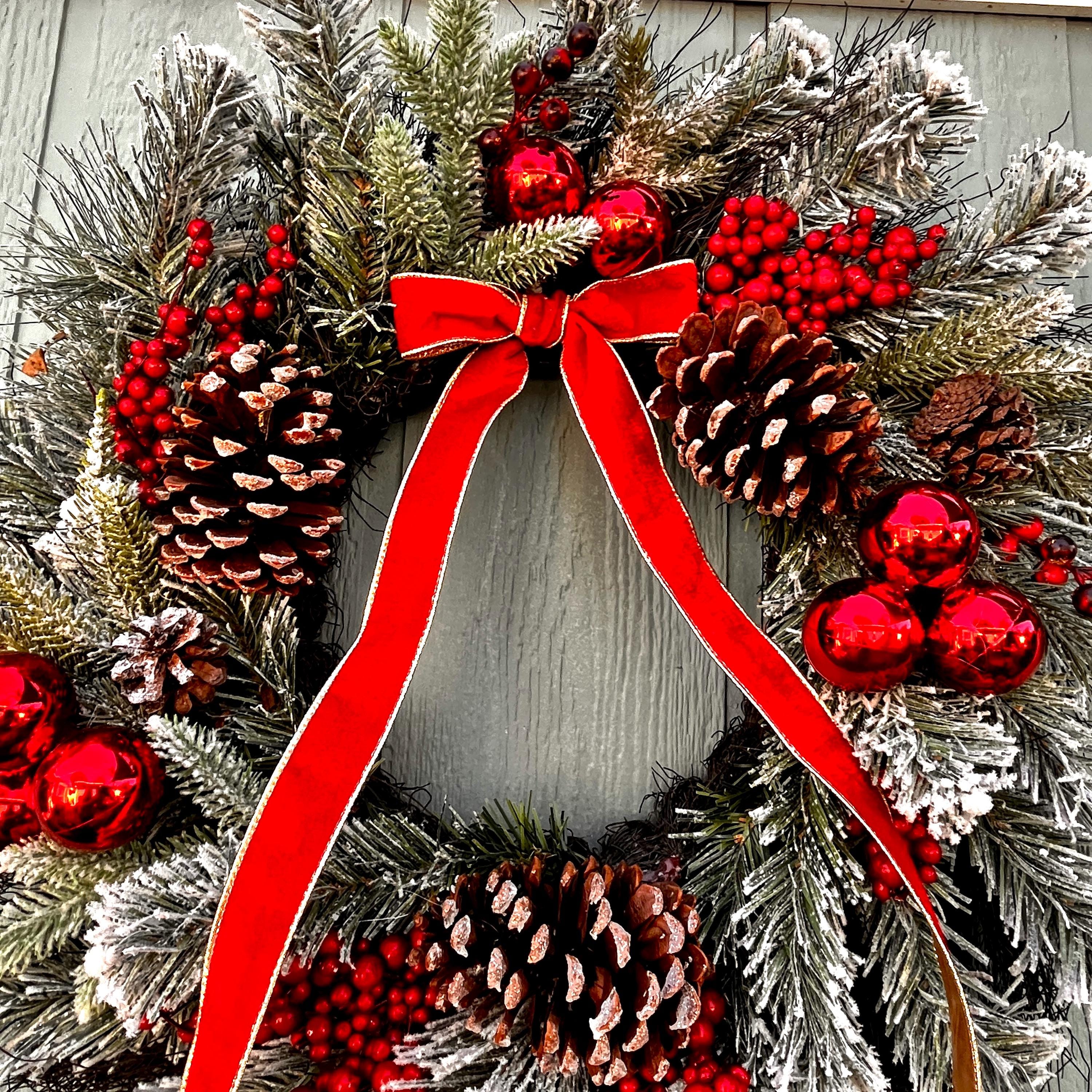 Flocked Christmas Wreath- red and gold ribbon- red ornaments- classic style-