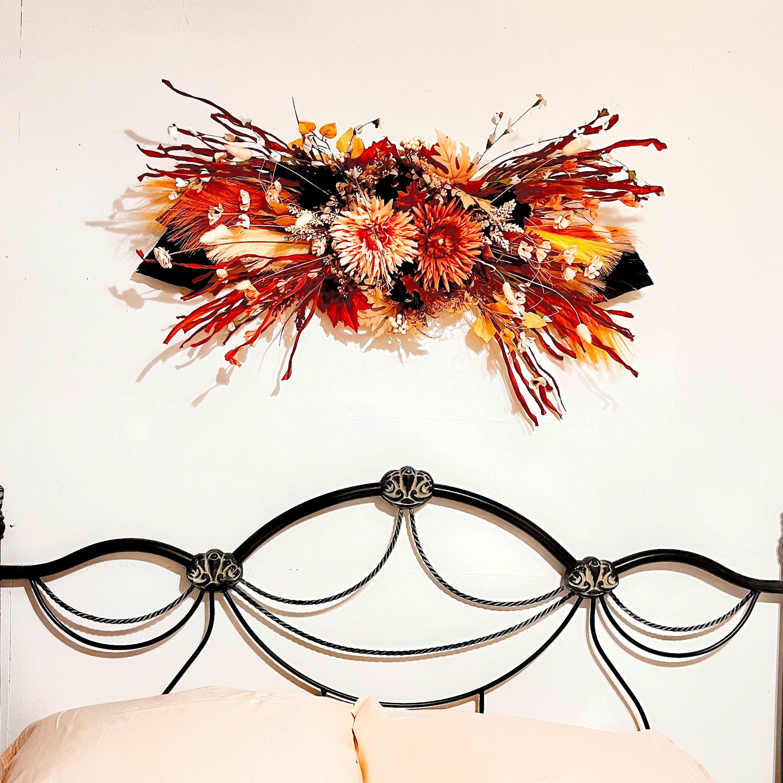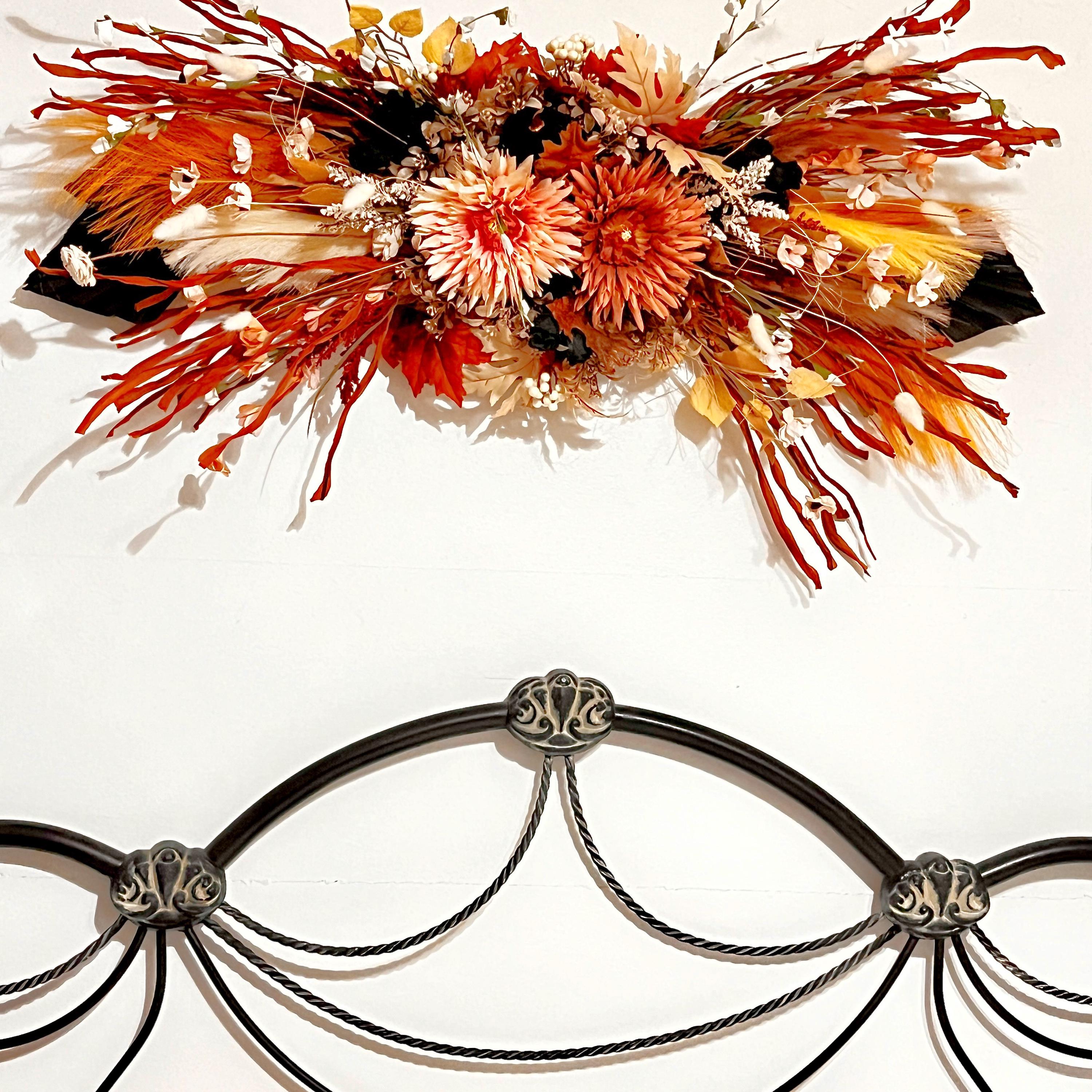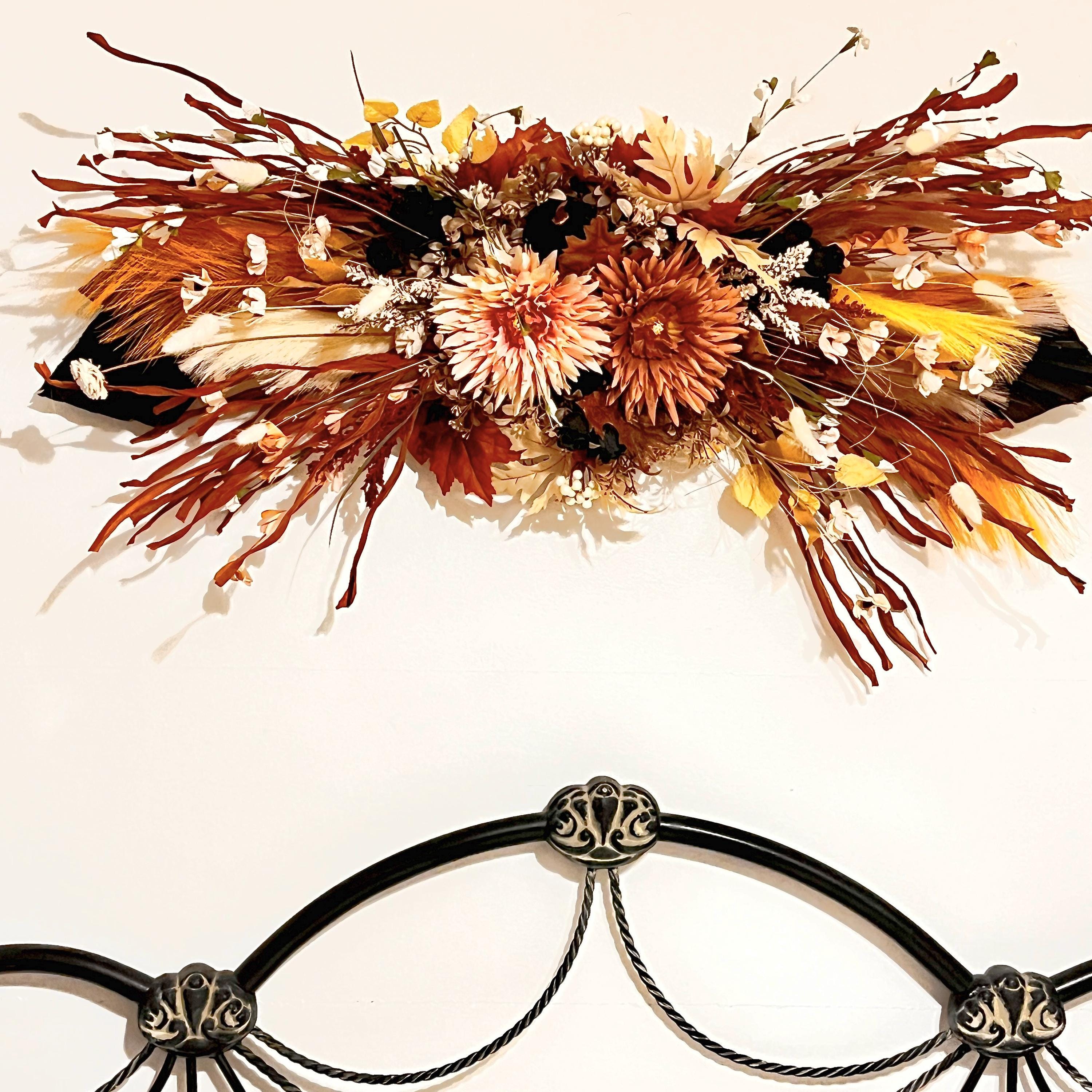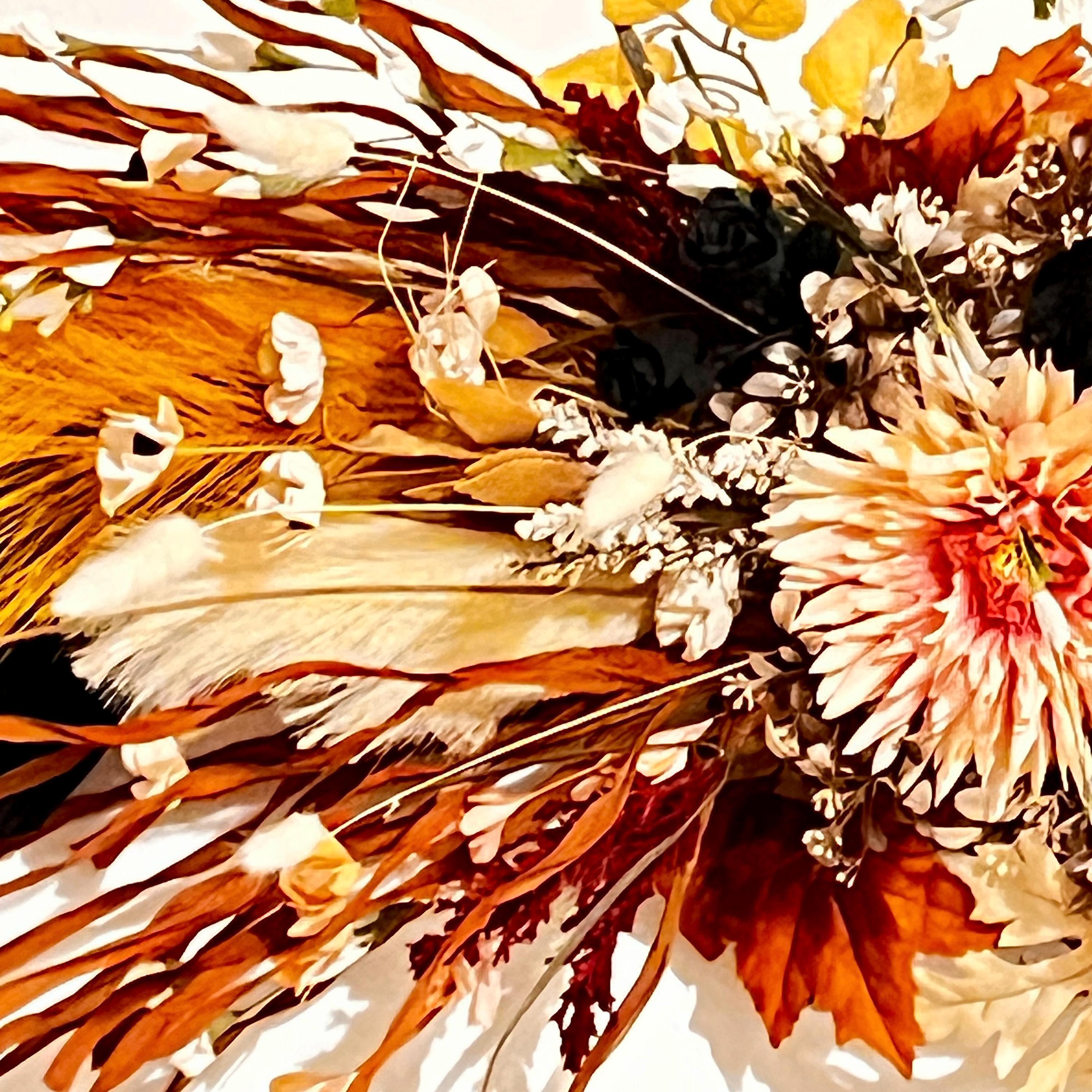Trendy /shabby chic/a little Bohemian accent lots of flowers and greens feathers stalks dried flowers wheat bunny tails large mums, every thing is well hot glued together or wired together. This is a swag with fall or year round colors/ terra cotta beige/ champagne white/ black nude/ very eye catching/ dramatic