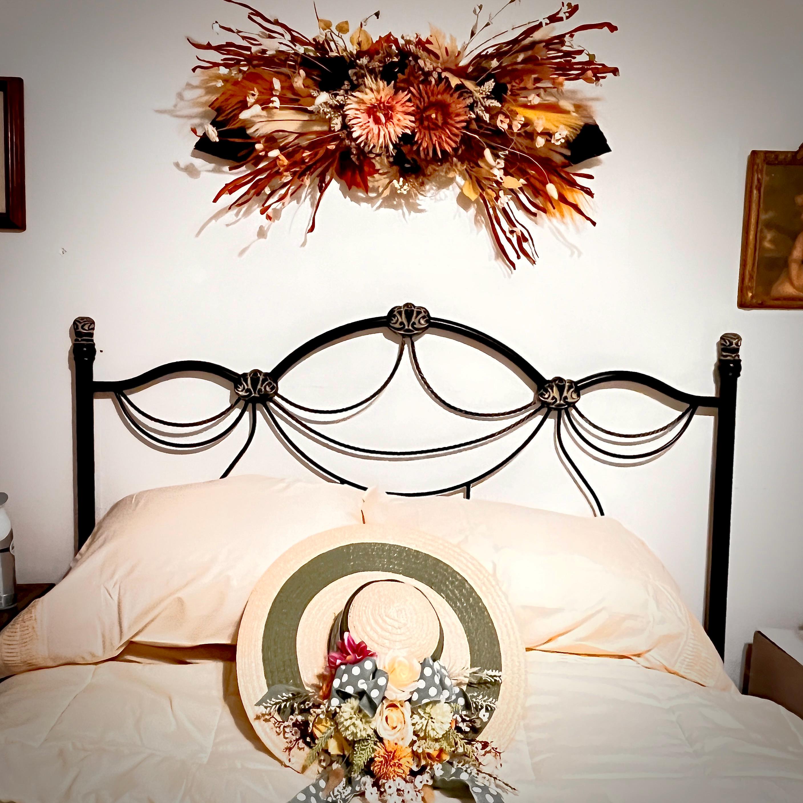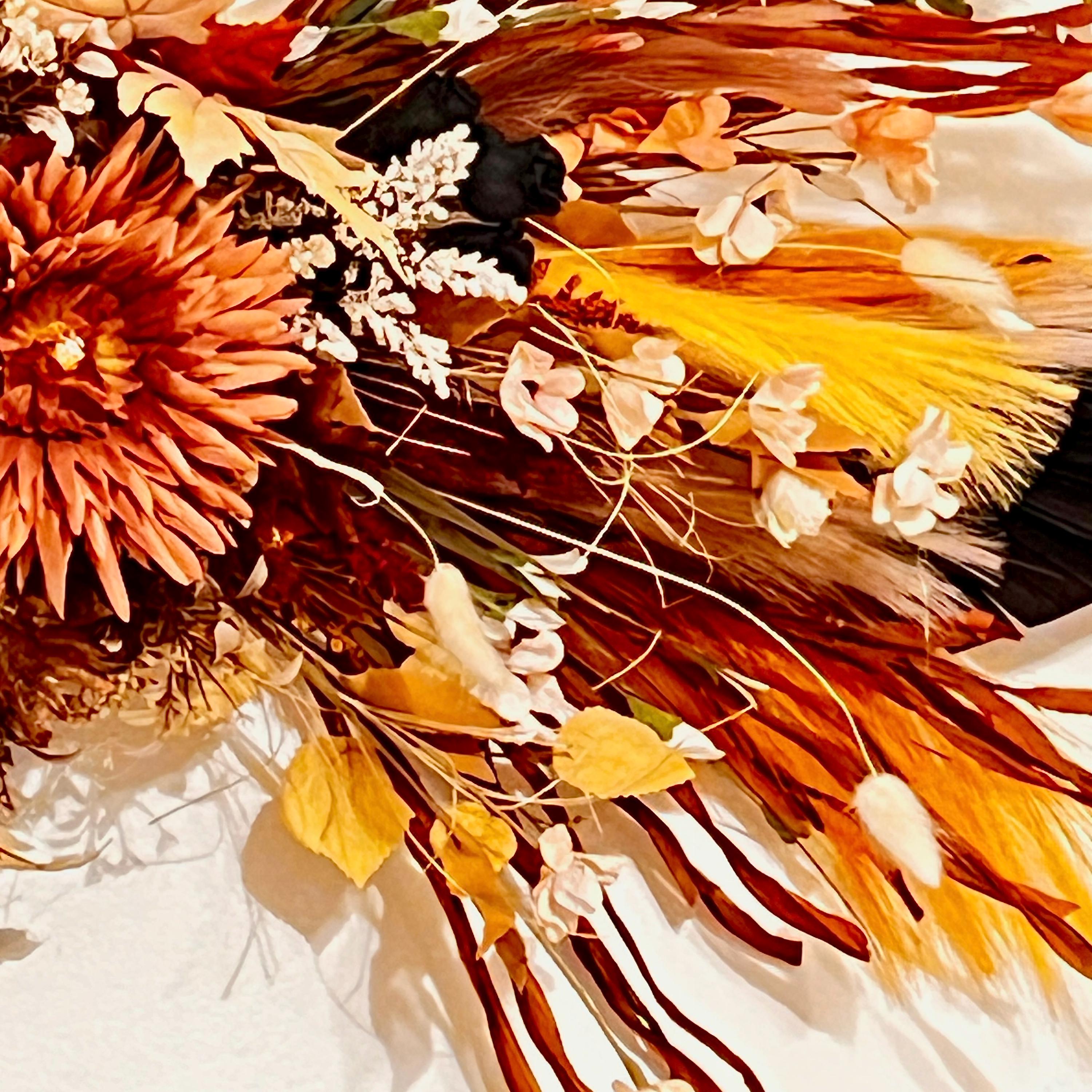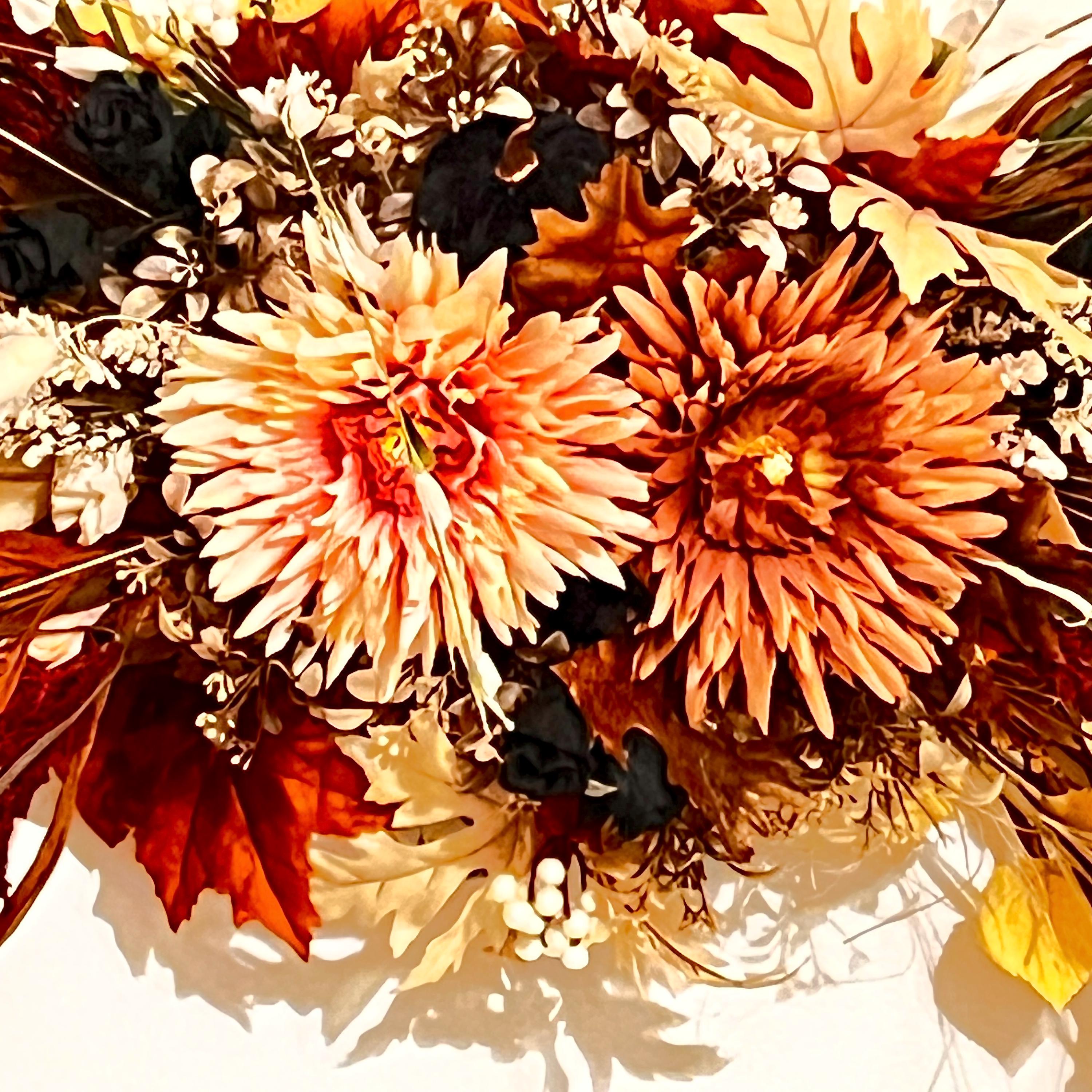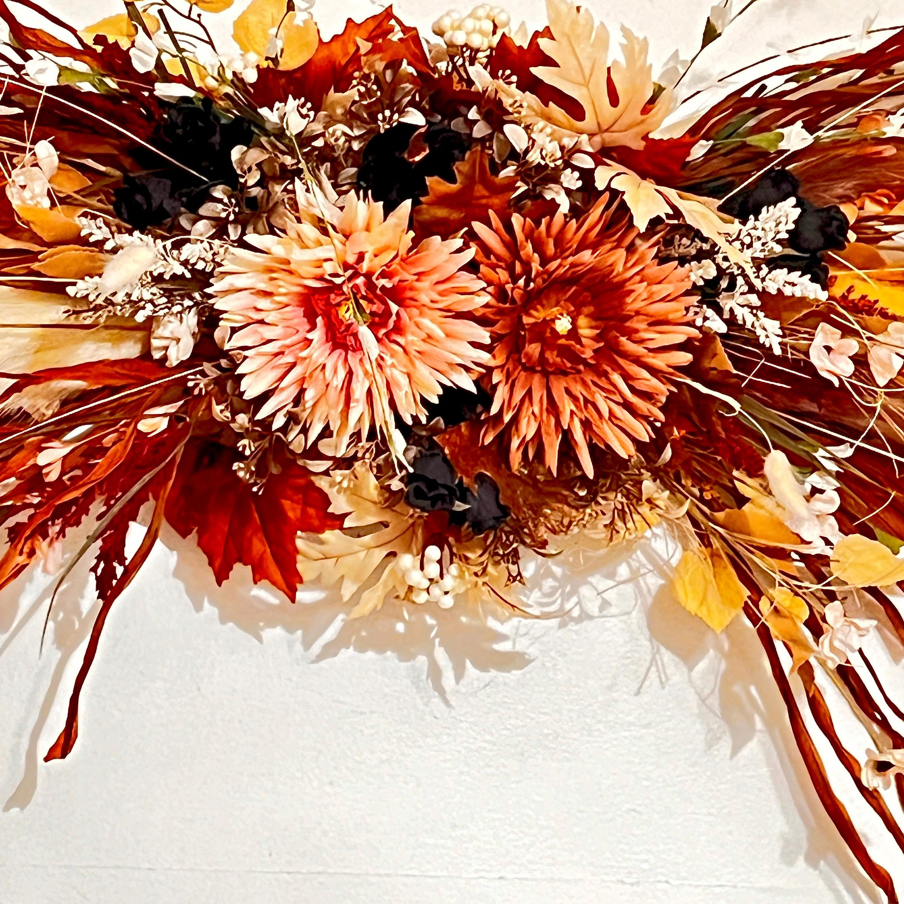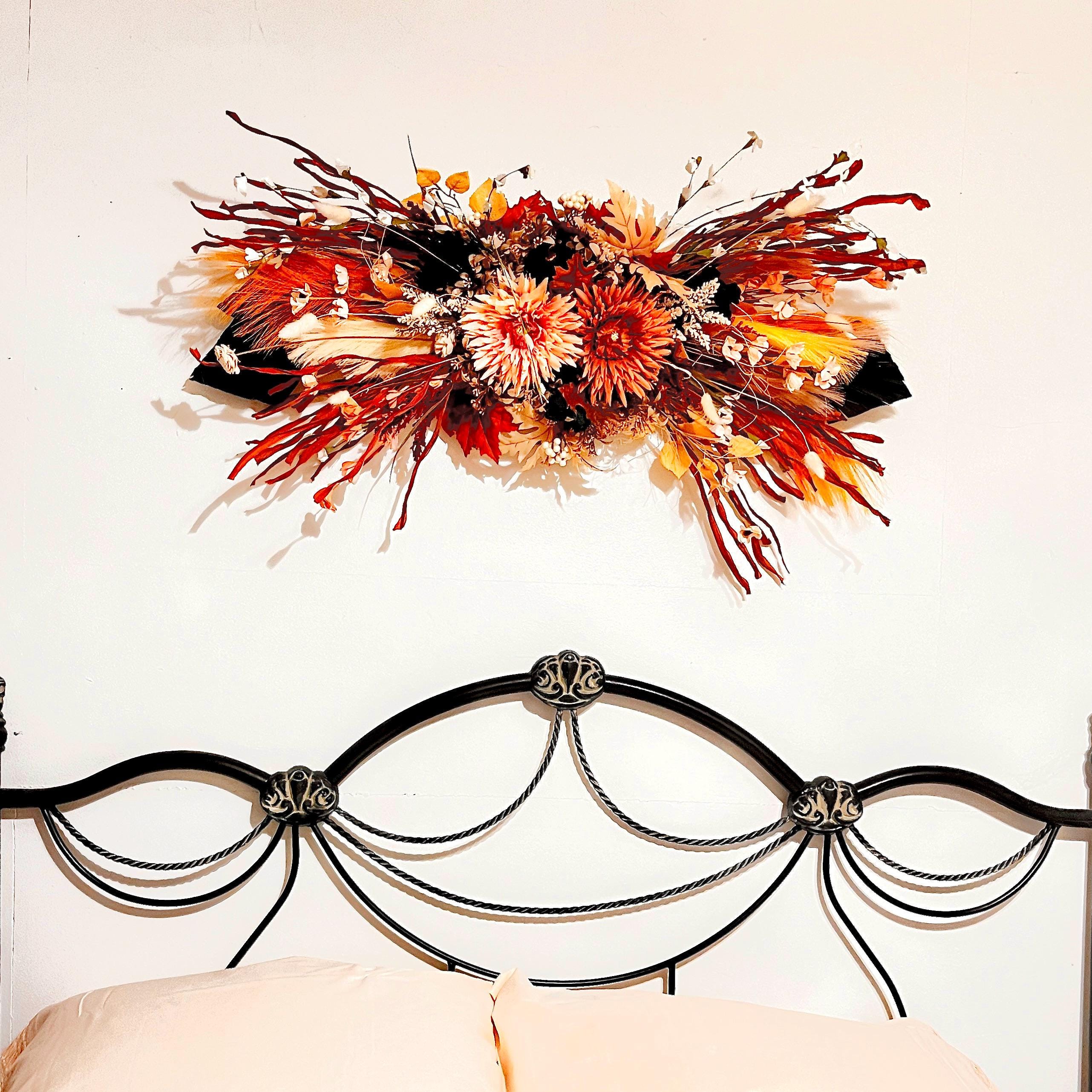 Trendy /shabby chic/a little Bohemian accent lots of flowers and greens feathers stalks dried flowers wheat bunny tails large mums, every thing is well hot glued together or wired together. This is a swag with fall or year round colors/ terra cotta beige/ champagne white/ black nude/ very eye catching/ dramatic